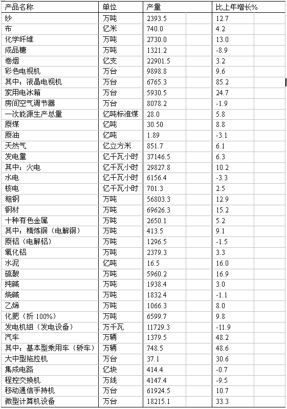 全年规模以上工业中,煤炭开采和洗选业增加值比上年增长8.3%;石油和天然气开采业增长4.8%;农副食品加工业增长15.9%;纺织业增长8.5%;通用设备制造业增长11.0%;专用设备制造业增长13.0%;交通运输设备制造业增长18.4%,其中汽车制造增长20.3%,船舶制造增长20.7%;通信设备、计算机及其他电子设备制造业增长5.3%;电气机械及器材制造业增长12.0%。6大高载能行业比上年增长10.6%,其中,非金属矿物制品业增长14.7%,化学原料及化学制品制造业增长14.6%,有色金属冶炼及压延加工业增长12.8%,黑色金属冶炼及压延加工业增长9.9%,电力、热力的生产和供应业增长6.0%,石油加工、炼焦及核燃料加工业增长5.2%。高技术制造业增加值比上年增长7.7%。