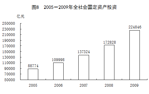 全年全社会固定资产投资224846亿元,比上年增长30.1%。分城乡看,城镇投资194139亿元,增长30.5%;农村投资30707亿元,增长27.5%。分地区看,东部地区投资95653亿元,比上年增长23.0%;中部地区投资49846亿元,增长35.8%;西部地区投资49662亿元,增长38.1%;东北地区投资23733亿元,增长26.8%。