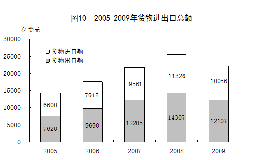 全年货物进出口总额22072亿美元,比上年下降13.9%。其中,货物出口12017亿美元,下降16.0%;货物进口10056亿美元,下降11.2%。进出口差额(出口减进口)1961亿美元,比上年减少1020亿美元。