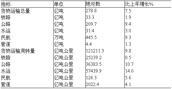 全年规模以上港口完成货物吞吐量69.1亿吨,比上年增长8.2%,其中外贸货物吞吐量21.4亿吨,增长8.6%。港口集装箱吞吐量12082万标准箱,下降5.8%。