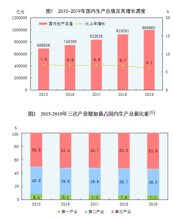 初步核算,全年国内生产总值[2]990865亿元,比上年增长6.1%。其中,第一产业增加值70467亿元,增长3.1%;第二产业增加值386165亿元,增长5.7%;第三产业增加值534233亿元,增长6.9%。第一产业增加值占国内生产总值比重为7.1%,第二产业增加值比重为39.0%,第三产业增加值比重为53.9%。全年最终消费支出对国内生产总值增长的贡献率为57.8%,资本形成总额的贡献率为31.2%,货物和服务净出口的贡献率为11.0%。人均国内生产总值70892元,比上年增长5.7%。国民总收入[3]988458亿元,比上年增长6.2%。全国万元国内生产总值能耗[4]比上年下降2.6%。全员劳动生产率[5]为115009元/人,比上年提高6.2%。