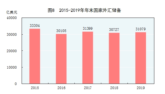 年末国家外汇储备31079亿美元,比上年末增加352亿美元。全年人民币平均汇率为1美元兑6.8985元人民币,比上年贬值4.1%。