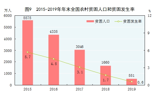 脱贫攻坚成效明显。按照每人每年2300元(2010年不变价)的农村贫困标准计算,年末农村贫困人口551万人,比上年末减少1109万人[26];贫困发生率[27]0.6%,比上年下降1.1个百分点。全年贫困地区[28]农村居民人均可支配收入11567元,比上年增长11.5%,扣除价格因素,实际增长8.0%。