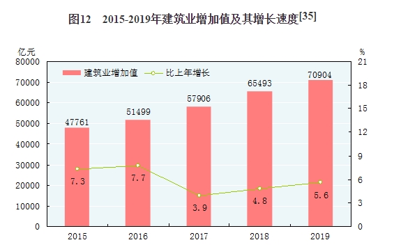 全年全社会建筑业增加值70904亿元,比上年增长5.6%。全国具有资质等级的总承包和专业承包建筑业企业利润8381亿元,比上年增长5.1%,其中国有控股企业2585亿元,增长14.5%。
