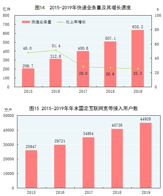 全年完成邮政行业业务总量[40]16230亿元,比上年增长31.5%。邮政业全年完成邮政函件业务21.7亿件,包裹业务0.2亿件,快递业务量635.2亿件,快递业务收入7498亿元。全年完成电信业务总量[41]106789亿元,比上年增长62.9%。年末全国电话用户总数179238万户,其中移动电话用户160134万户。移动电话普及率上升至114.4部/百人。固定互联网宽带接入用户[42]44928万户,比上年末增加4190万户,其中固定互联网光纤宽带接入用户[43]41740万户,增加4907万户。全年移动互联网用户接入流量1220亿GB,比上年增长71.6%。全年软件和信息技术服务业[44]完成软件业务收入71768亿元,按可比口径计算,比上年增长15.4%。
