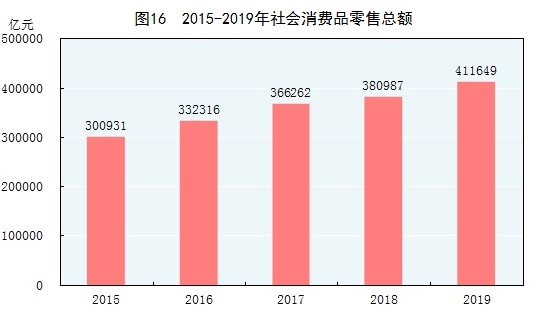 全年社会消费品零售总额411649亿元,比上年增长8.0%。按经营地统计,城镇消费品零售额351317亿元,增长7.9%;乡村消费品零售额60332亿元,增长9.0%。按消费类型统计,商品零售额364928亿元,增长7.9%;餐饮收入额46721亿元,增长9.4%。