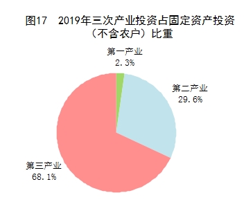在固定资产投资(不含农户)中,第一产业投资12633亿元,比上年增长0.6%;第二产业投资163070亿元,增长3.2%;第三产业投资375775亿元,增长6.5%。民间固定资产投资[47]311159亿元,增长4.7%。基础设施投资[48]增长3.8%。六大高耗能行业投资增长4.7%。