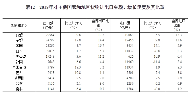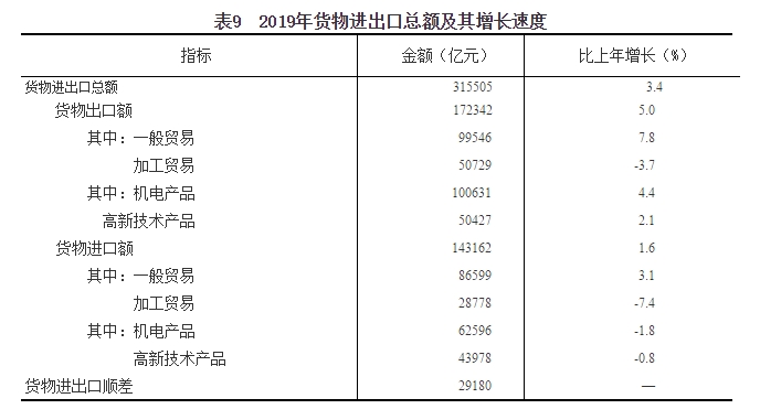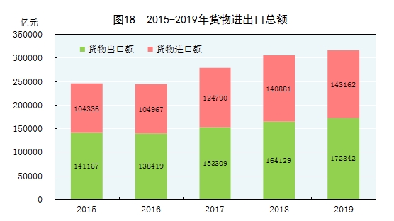 全年货物进出口总额315505亿元,比上年增长3.4%。其中,出口172342亿元,增长5.0%;进口143162亿元,增长1.6%。货物进出口顺差29180亿元,比上年增加5932亿元。对“一带一路”[52]沿线国家进出口总额92690亿元,比上年增长10.8%。其中,出口52585亿元,增长13.2%;进口40105亿元,增长7.9%。