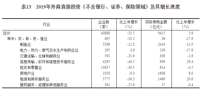 全年外商直接投资(不含银行、证券、保险领域)新设立企业40888家,比上年下降32.5%。实际使用外商直接投资金额9415亿元,增长5.8%,折1381亿美元,增长2.4%。其中“一带一路”沿线国家对华直接投资新设立企业5591家,增长24.8%;对华直接投资金额(含通过部分自由港对华投资)576亿元,增长36.0%,折84亿美元,增长30.6%。全年高技术产业实际使用外资2660亿元,增长25.6%,折391亿美元,增长21.7%。
