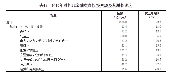 全年对外非金融类直接投资额7630亿元,比上年下降4.3%,折1106亿美元,下降8.2%。其中,对“一带一路”沿线国家非金融类直接投资额150亿美元,下降3.8%。