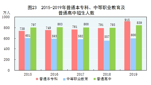 全年研究生教育招生91.7万人,在学研究生286.4万人,毕业生64.0万人。普通本专科招生914.9万人,在校生3031.5万人,毕业生758.5万人。中等职业教育[70]招生600.4万人,在校生1576.5万人,毕业生493.4万人。普通高中招生839.5万人,在校生2414.3万人,毕业生789.2万人。初中招生1638.8万人,在校生4827.1万人,毕业生1454.1万人。普通小学招生1869.0万人,在校生10561.2万人,毕业生1647.9万人。特殊教育招生14.4万人,在校生79.5万人,毕业生9.8万人。学前教育在园幼儿4713.9万人。九年义务教育巩固率为94.8%,高中阶段毛入学率为89.5%。