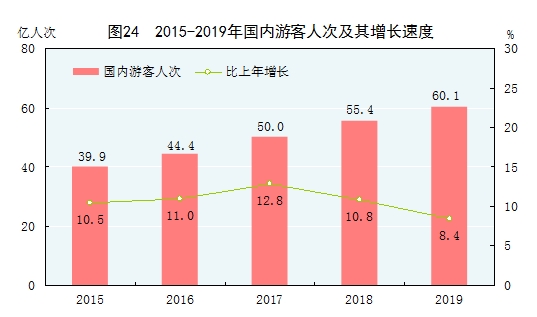 全年国内游客60.1亿人次,比上年增长8.4%;国内旅游收入57251亿元,增长11.7%。入境游客14531万人次,增长2.9%。其中,外国人3188万人次,增长4.4%;香港、澳门和台湾同胞11342万人次,增长2.5%。在入境游客中,过夜游客6573万人次,增长4.5%。国际旅游收入1313亿美元,增长3.3%。国内居民出境16921万人次,增长4.5%。其中因私出境16211万人次,增长4.6%;赴港澳台出境10237万人次,增长3.2%。