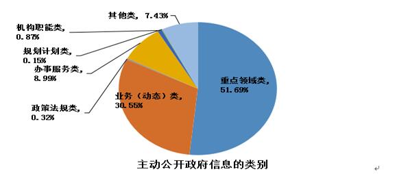 (二)主要类别。我市依托“中国·大连”“政府信息公开专栏”“公共企事业单位办事公开专栏”及各地区、各部门门户网站主动公开政府信息的主要类别包括:重点领域类信息96950条,占51.69%;业务(动态)类57288条,占30.55%;办事服务类信息16863条,占8.99%;机构职能类1637条,占0.87%;政策法规类607条,占0.32%;规划计划类277条,占0.15%;其他类13931条,占7.43%。