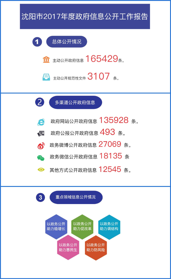 按照《 印发关于贯彻落实国务院办公厅<2017年政务公开工作要点>工作的通知》要求,编制印发《沈阳市2017年政务公开工作要点任务明细表》,并以市政府门户网站和各地区、各职能部门网站为依托,开设政务公开重点工作专栏,全面推进决策、执行、管理、服务、结果公开,着力落实就业创业信息、市场监管信息、减税降费信息、扶贫信息、棚户区改造信息、环保信息、稳定市场预期信息、重大决策预公开信息等重点政务公开信息,以政府信息公开助力稳增长、促改革、调结构、惠民生、防风险。