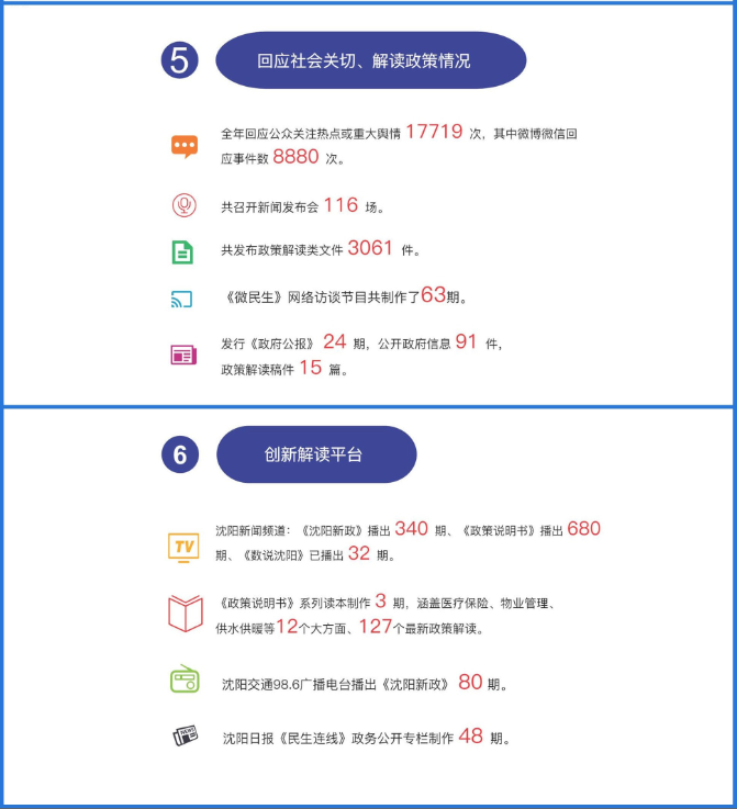 2.沈阳新闻频道《沈阳新政》播出340期、《政策说明书》播出680期、《数说沈阳》播出32期;沈阳交通98.6广播电台播出《沈阳新政》80期;《政策说明书》系列读本制作3期,向全市社区免费发放,读本内容丰富,贴近民意,涵盖医疗保险、物业管理、供水供暖等12个大方面、127个最新政策解读;沈阳日报《民生连线》政务公开专栏制作48期,答复解决问题140余个;《微民生》网络访谈节目共制作了63期。内容包括“幸福沈阳、共同缔造”、“打造国际化营商环境”、“义务教育”、“贯彻落实十九大精神”四大主题;受理《民心网》政策咨询123件,群众对政策咨询答复比较满意;受理《民心网内参》86件,按时反馈率、群众满意率、优秀率均为100%;《政务公开报》已编辑制作20期,发放35万份,投放覆盖了全市各地区各部门。全年沈阳政务微信发布信息911条,微博发布信息1119条,微博处理群众诉求5件,其中疑难件1件。政务短信发布共13期,累计发送至1414万联通手机用户。